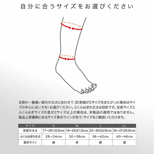 足首の一番細い部分の大きさに合わせて(計測値が2サイズをまたがった場合はサイズの中心に近い方を)お選びください。 ふくらはぎの太さは目安です。足首サイズとふくらはぎサイズの差が2サイズ以上の場合は、本製品の適用ではありません。