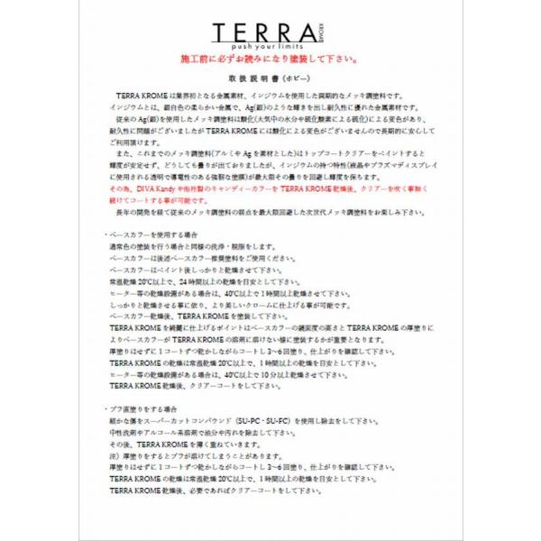 商品説明 テラクロームは業界初となる金属素材、インジウムを使用した画期的なメッキ調塗料です。 インジウムとは銀白色の柔らかい金属でAg(銀)の様な輝きを出せる事が特徴です。 さらにAgが持つ酸化(大気中の水分や硫化酸素による硫化)による変色が無く、自動車やバイクは勿論、 建築物等にも安心してご使用頂けます。 又、今迄使用されて来たAgやアルミのメッキ調塗料はクリアーを塗装すると輝度が安定せず、 どうしても曇りが出ておりましたが、インジウムの持つ特性(液晶やプラズマディスプレイに使用される透明で 導電性のある強靭な塗膜)が最大限その曇りを回避し輝度を保ちます。