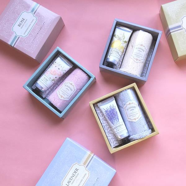 香り豊かなハンドクリームとふわふわハンカチタオルのセット商品です。