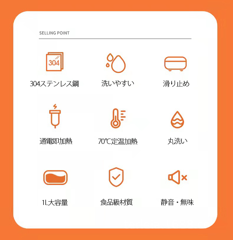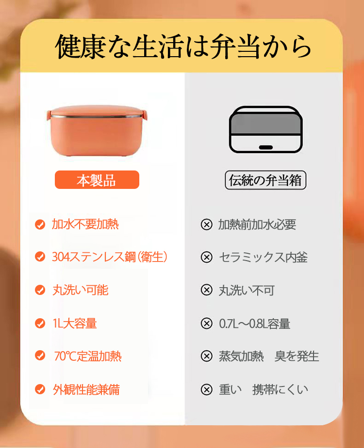 水必要なし、均一な加熱:平常にお弁当を加熱します時に、水分が抜けてパサパサになりご飯が硬くなって 、緑葉野菜が黄色になりました。本製品が水必要なし、均一な70度360循環させて加熱することで、以上の問題が発生しません
