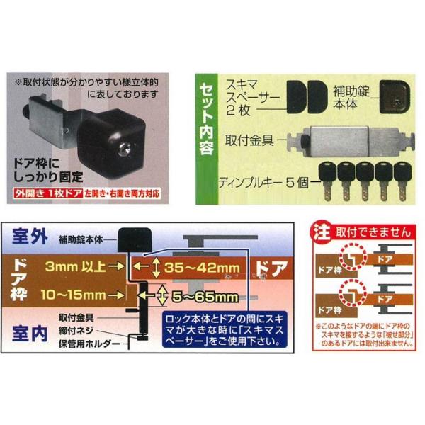 セット内容:スキマスペーサー2枚、補助錠本体、ディンプルキー5個、取付金具