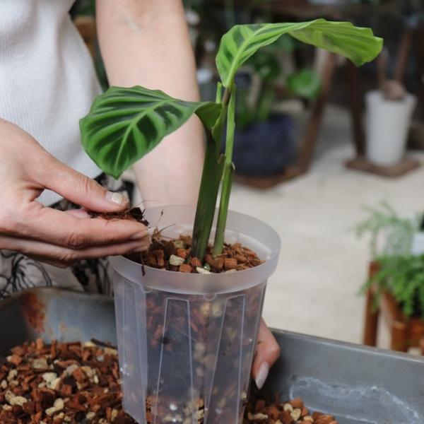 保湿力もあり、ココチップと軽石をブレンドすることで用土がギュッと固まりにくく、たくさん空気を鉢の中に保持します。保水しても軽く、ハンギングにも最適です。