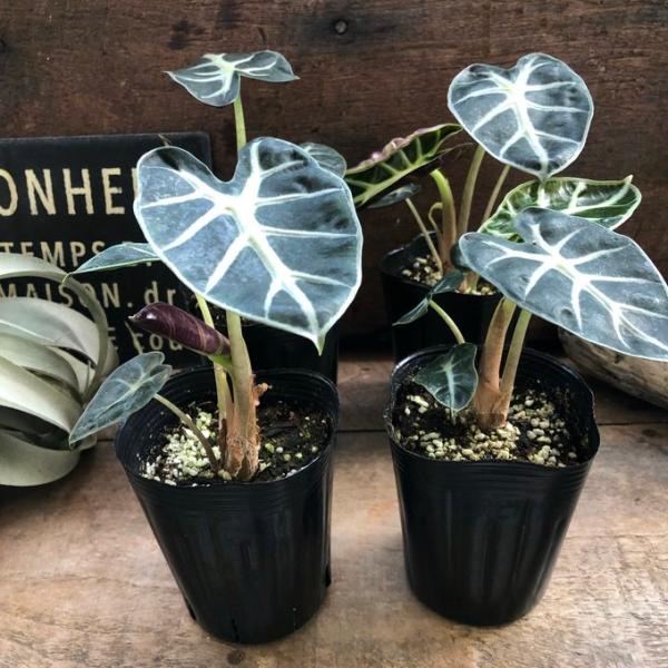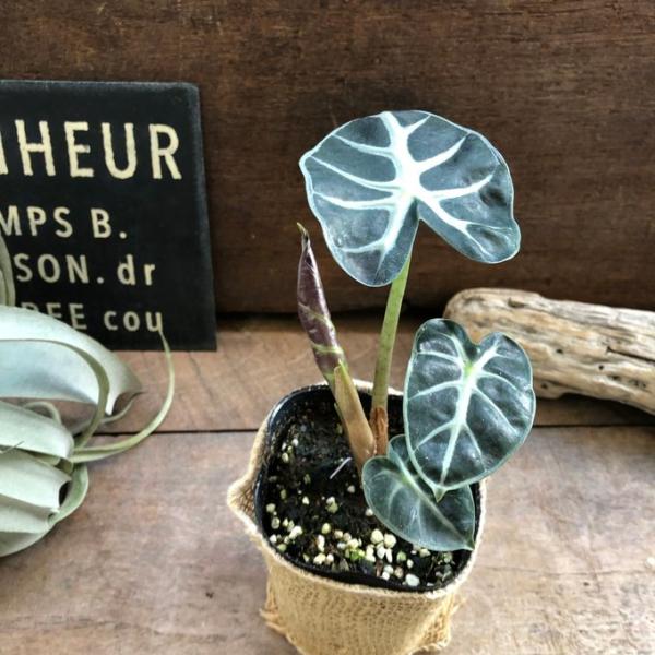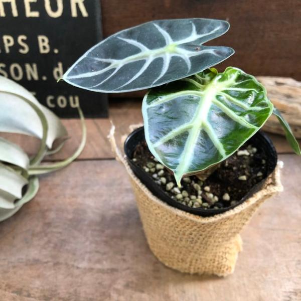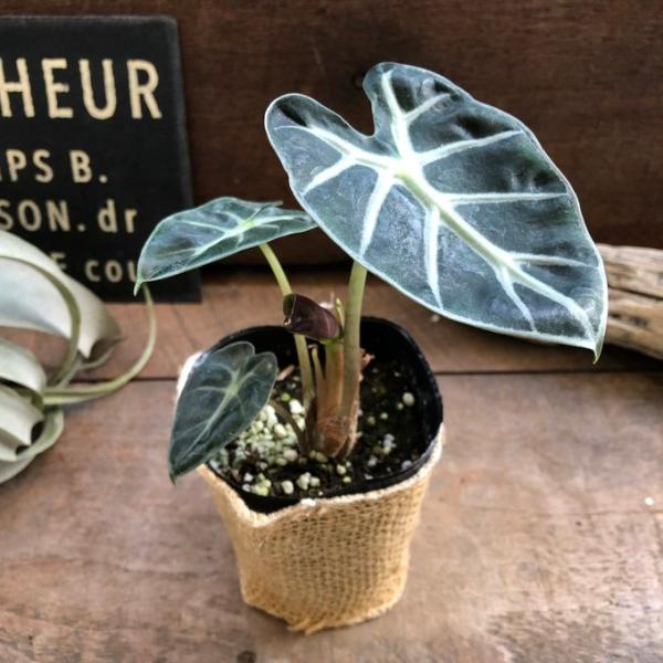 黒い照りのある葉にシルバーの葉脈が浮き出る流通の少ないアロカシアで人気です。