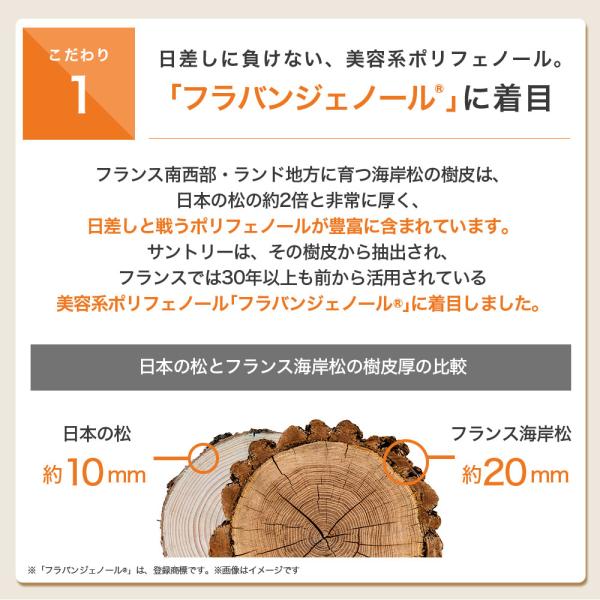 地中海の日差しの下で育つフランス海岸松の樹皮からとれる美容系ポリフェノール「フラバンジェノール」。サントリーの長年のポリフェノール研究から生まれた美容メソッド「ブライトアプローチ」の発想に基づいて、フラバンジェノールに3つの美容成分セラミド・火棘・ビタミンCを配合。透き通るように輝く毎日を応援します。