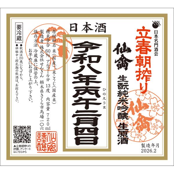 予約<特別限定酒>立春朝搾り 仙禽 純米吟醸 生原酒 720ml せんきん 栃木 日本酒 地酒 縁起酒 特別限定酒 数量限定 チルド便 2/5以降発送予定