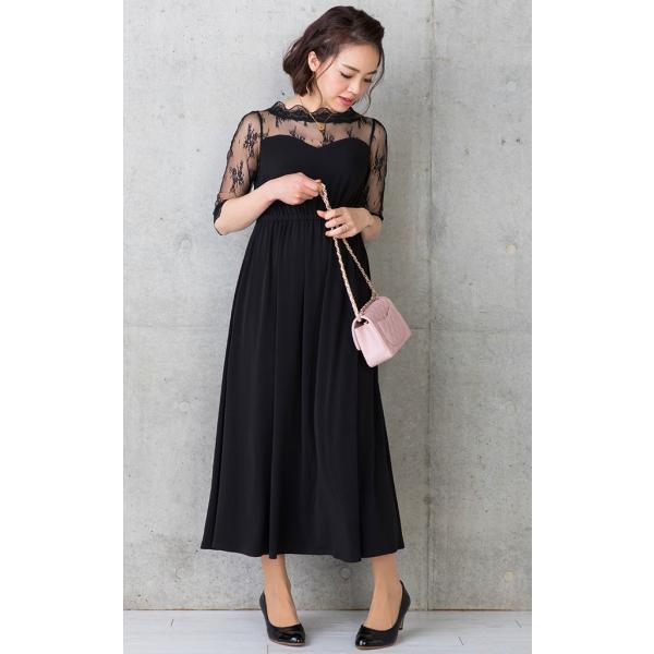 肩や腕の透け感が大人っぽくエレガント、流れるようなロング丈スカートの落ち感が上品。
