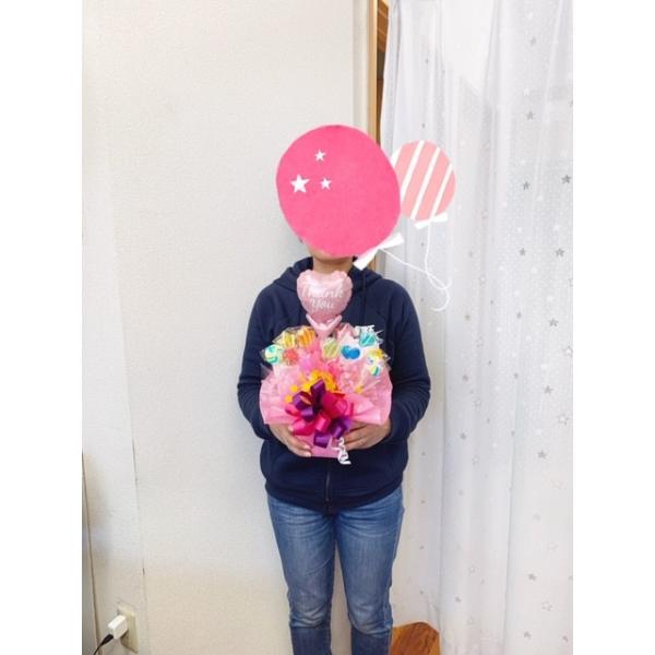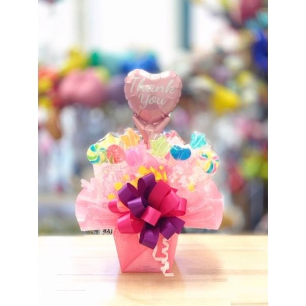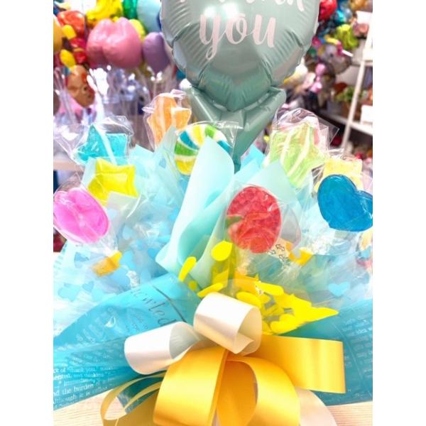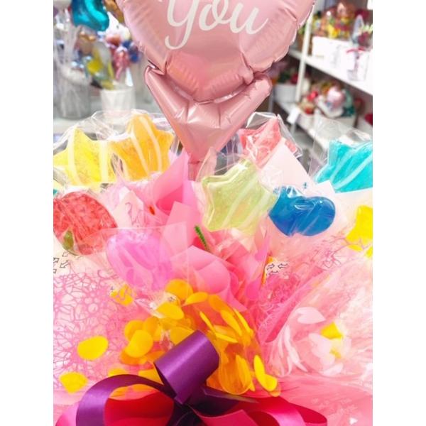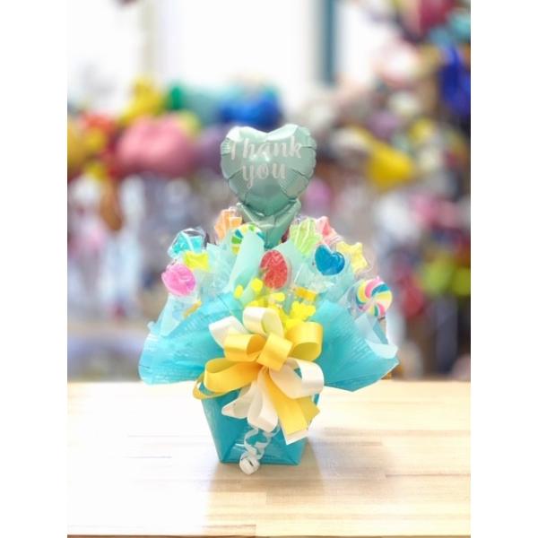 可愛いキャンディが沢山入っている賑やかなキャンディブーケ。サイズH30×W23 棒付きキャンディ11個