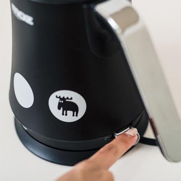 ブランドロゴと『エルク(ヘラジカ)』を配置し、北欧らしいシンプルに仕上げた電気ケトル。