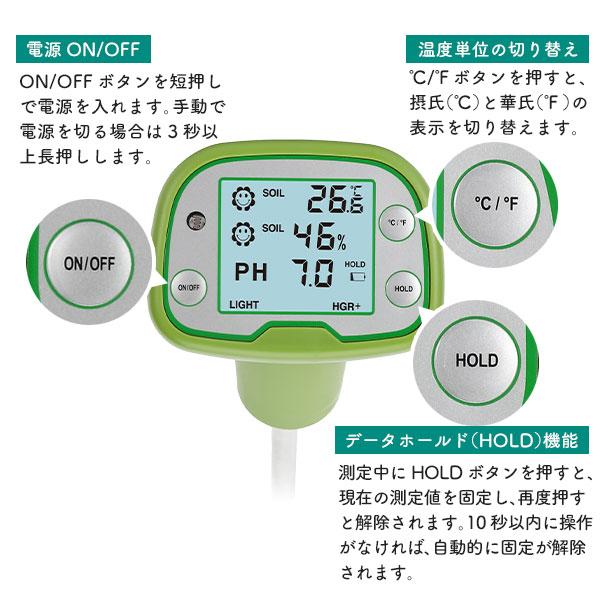多機能 土壌計測器 土の状態 温度 湿度 pH値 酸性度 光照度 小型 計測機 家庭用 業務用 土の管理 家庭菜園 ガーデニング 畑 店舗 オフィス 作業現場 計測器