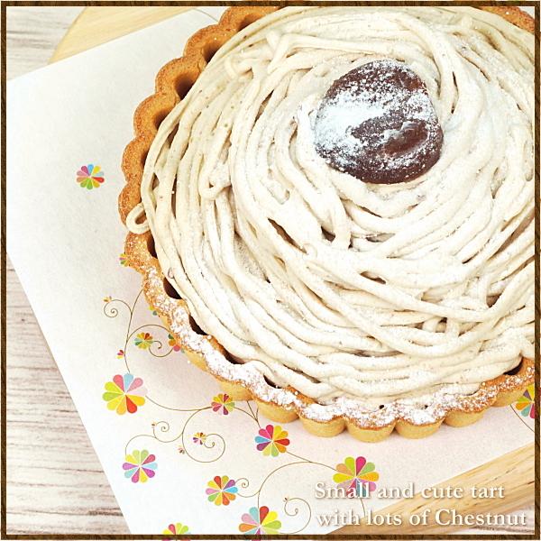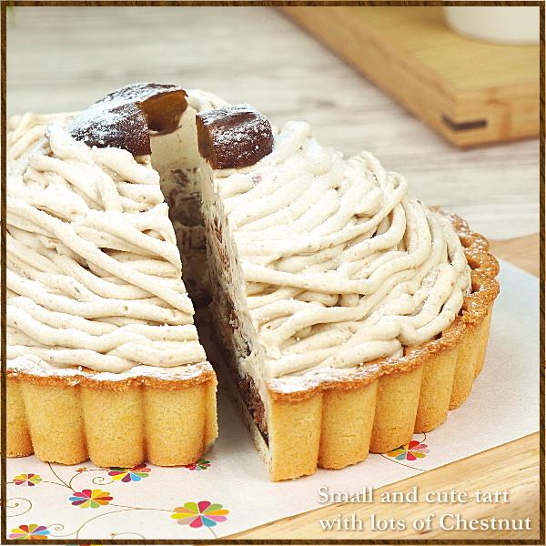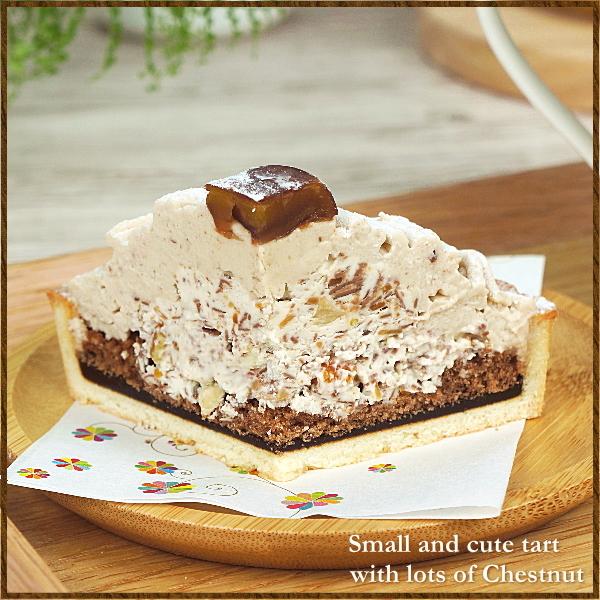 栗をふんだんに使用したタルトケーキ4号サイズ。栗独特のねっとりとした食感と優しい甘さ、そしてチョコレートの味わいが加わったのが、このタルトなのです。