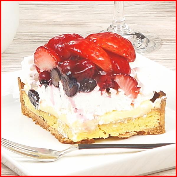 ●4種類のベリーをたっぷり使用したタルトケーキ。4種類のベリーの味わいを、サクサクと歯切れの良い食感のタルト生地と共にどうぞお楽しみください
