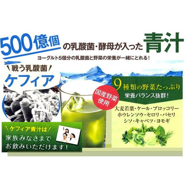ケフィアとはコーカサス地方を起源とする、発酵した乳飲料です。日本では「ヨーグルトきのこ」として有名です。ケフィアとヨーグルトの大きな違いは、ヨーグルトが2〜3種類の乳酸菌による単独発酵に対し、ケフィアは8種類の乳酸菌と3種類の酵母の共生発酵によってできる優れた発酵乳です。ケフィアには美容ビタミンと言われるビタミンB1、B2、B6、B12、葉酸などのビタミンB群とカルシウムなど含まれています。農薬や化学肥料を使わずに栽培された大麦若葉、ケールを厳選使用。さらに栄養のバランスを考え7種類(キャベツ、ブロッコリー、セロリ、パセリ、ホウレンソウ、シソ、ヨモギ)の野菜をブレンドしています。 毎日の健康を考え、αリノレン酸の多いえごま葉、カルシウム豊富な牡蠣殻、たんぱく・アミノ酸など栄養のバランスが良いスピルリナ、スーパーフードとして注目のキヌアスプラウトも配合しています。お召し上がり方は、1包を、100cc程度の水又はぬるま湯で溶かしてお召し上がりください。