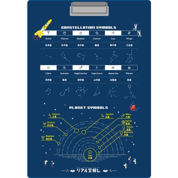 謎解きに便利なアルファベット表に加え、今までありそうでなかった12星座、惑星一覧も記載さている!周遊型イベントで便利に使おう!