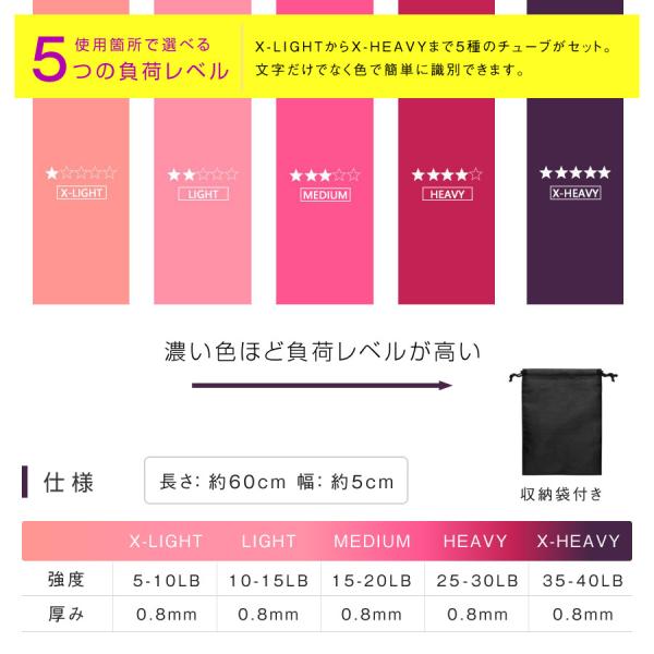 強度の違う5本セットでトレーニングする部位によって、バンドの強度を変えるのがおすすめ。