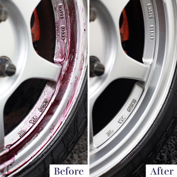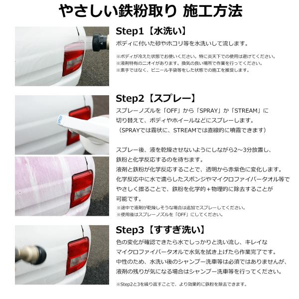 ボディに水を掛けた後、液剤をスプレーして、赤紫色に変わったら水でしっかり流すだけ。