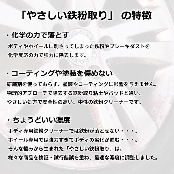 数ある商品を検証・試行錯誤を重ね、鉄粉除去性能は高く、ボディへの攻撃性は低くなるように、最適な濃度で処方しました。