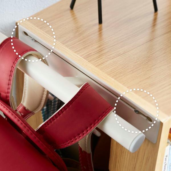 カラーボックスのネジを活用して、側面にランドセルやリュックを掛けられる収納ハンガー。小物を掛けられるフック付きで、お子様の学用品をまとめて収納できます。付属の木ネジを使って壁面にも収納可能。