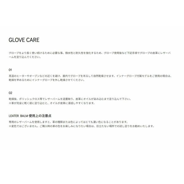 撥水性と耐久性を強化するため、グローブ使用後に皮革にレザーバームを塗り込んでください。