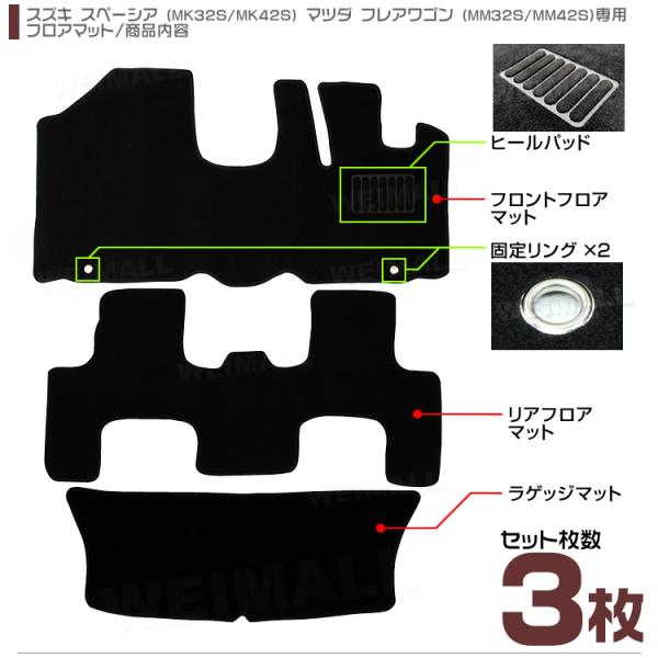 スズキ スペーシア MK32S MK42S フロアマット 3点セット カーマット マツダ フレアワゴン MM32S MM42S 難燃性 ヒールパット付 黒ブラック
