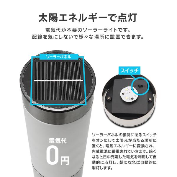 ソーラーパネルが日中太陽の光で充電し、夕暮れになると自動的に点灯します。