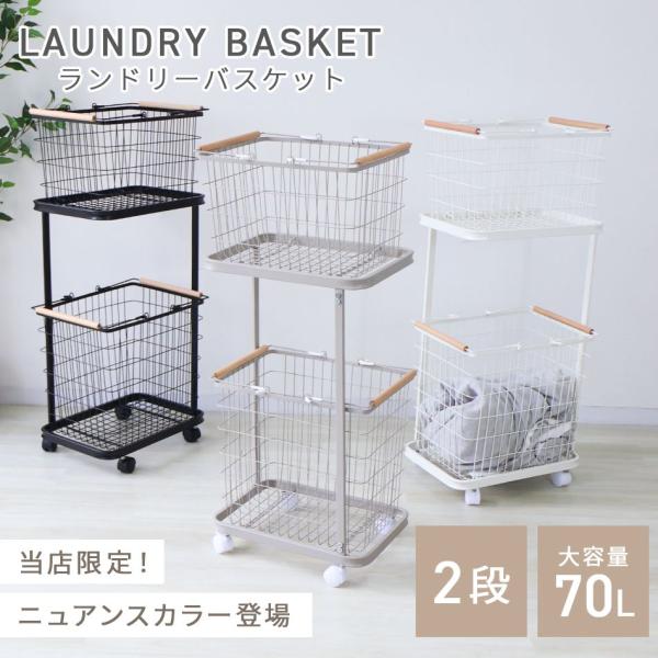 ランドリーバスケット 2段 70L スクエア 大容量 スリム 大容量 ワイヤーバスケット 省スペース 洗濯籠 キャスター付き 洗濯物 脱衣かご 新生活 カバー無し