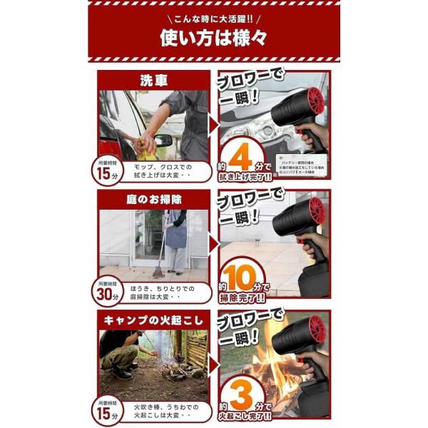 このダストブロワーは、洗車の拭き上げ、車内のゴミやホコリ飛ばし、除雪、キーボードの掃除、庭の掃除、マットのゴミの除去、扇風機代わり、ペットの入浴後の乾燥、炭火起こしなどさまざまなお掃除の場面で幅広く活躍できます。