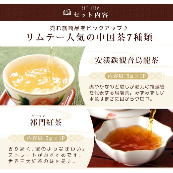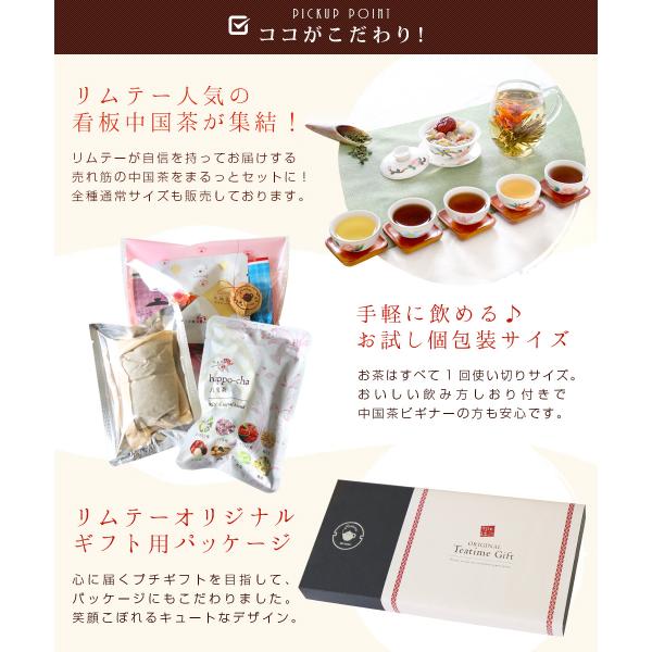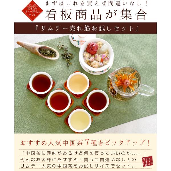 1.買って間違いなし!リムテーの看板中国茶が一挙集結。リムテー人気の中国茶7種をお試しサイズでセットにしました。飲み方のしおり付きで初めてでも美味しく本格中国茶を楽しめます♪