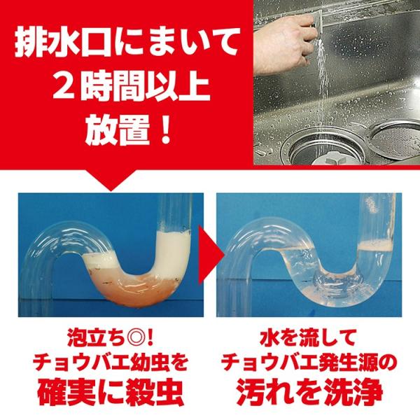 ・殺虫成分(エトフェンプロックス)でチョウバエ幼虫を殺虫駆除します。