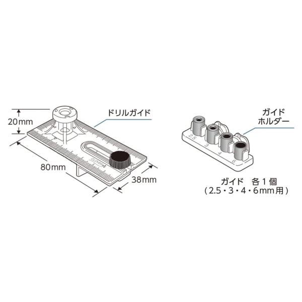 ドリルガイド:ABS樹脂、ネジ:ナイロン・鋼、ガイド:ステンレス、ガイドホルダー:ABS樹脂