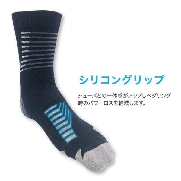 3DSOXによる足の形状に合わせたフィット性の高い立体設計をベースに、シューズとの一体感と快適性を加速させる足裏と甲のWグリップ、クッションパッド。