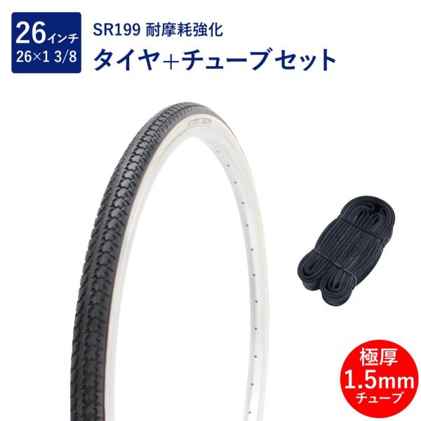 自転車 タイヤ 26インチ 耐摩耗タイヤ チューブ セット 英式 バルブ 極厚チューブ 1.5mm SR199 26×1-3/8 W/O 黒/白 タチ巻 Shinko シンコー