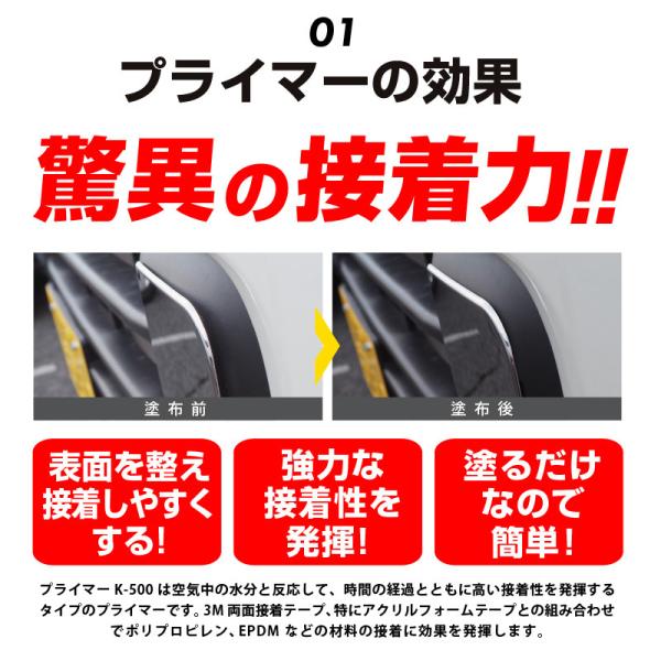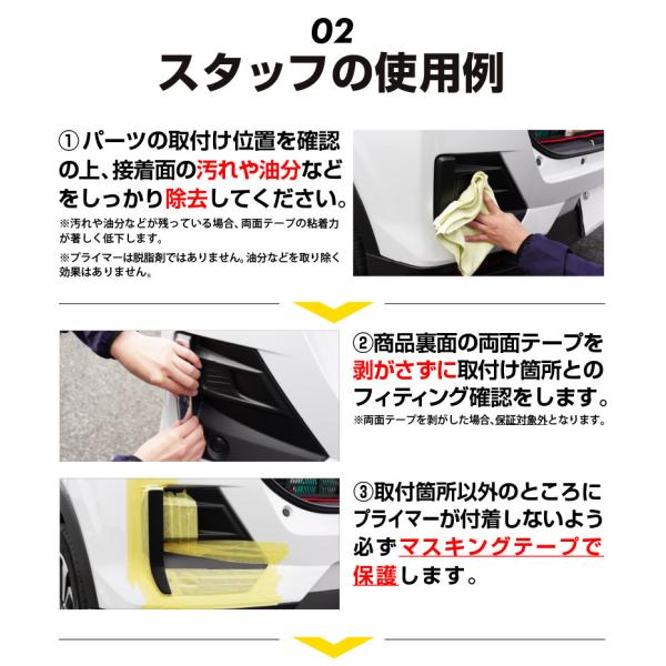 通常パーツに取り付け済の両面テープを貼る前の下地作りにご利用いただくことで、粘着度が増し両面テープの強度が増します。