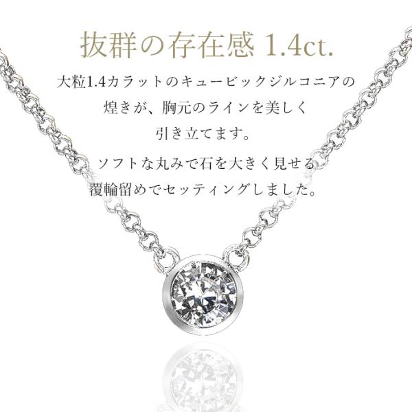 1.4カラットのキュービックジルコニアを、ソフトな丸みで石を大きく見せる覆輪留めでセッティング、一粒ながら上品な存在感が有ります。