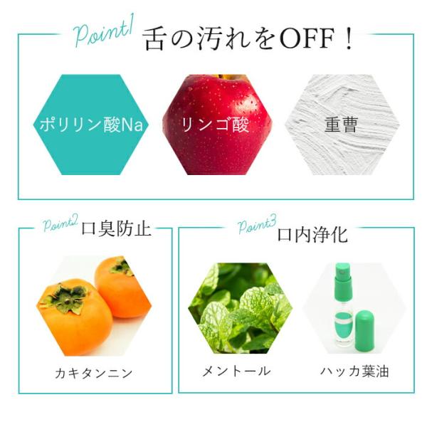 ポリリン酸Na、リンゴ酸、重曹ジェル:舌の汚れを浮かせる