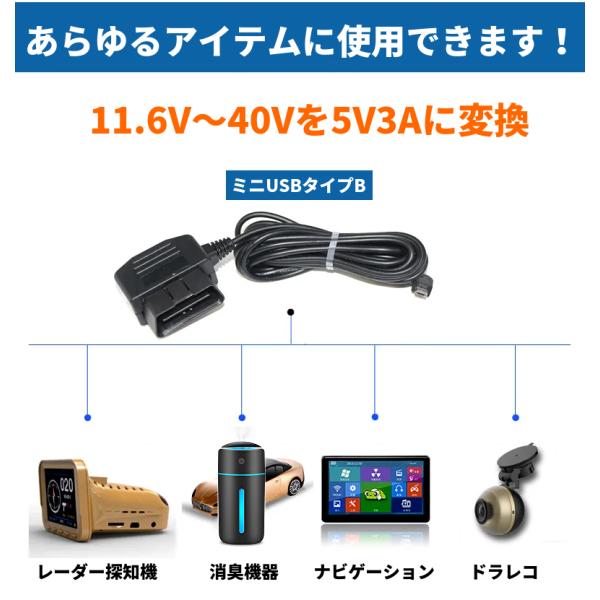 OBDII電源ケーブル ドライブレコーダー用 カーナビ用 電源ケーブル OBD接続 12V車24V車対応 挿し込むだけ 駐車監視用 降圧ケーブル mini-USBタイプ