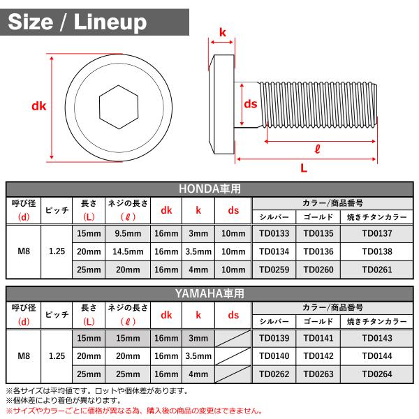 ブレーキディスク ローターボルト M8×20mm P1.25 ヤマハ用 フラットヘッド ステンレス シルバーカラー TD0140