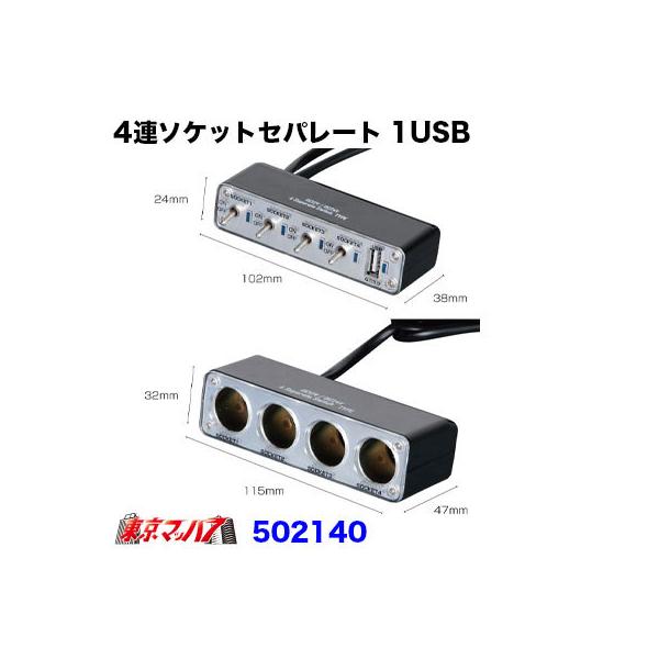 トラック用品 ON/OFFスイッチ機能付きセパレートタイプ4連ソケット USBポート付き 12V/24V車共用