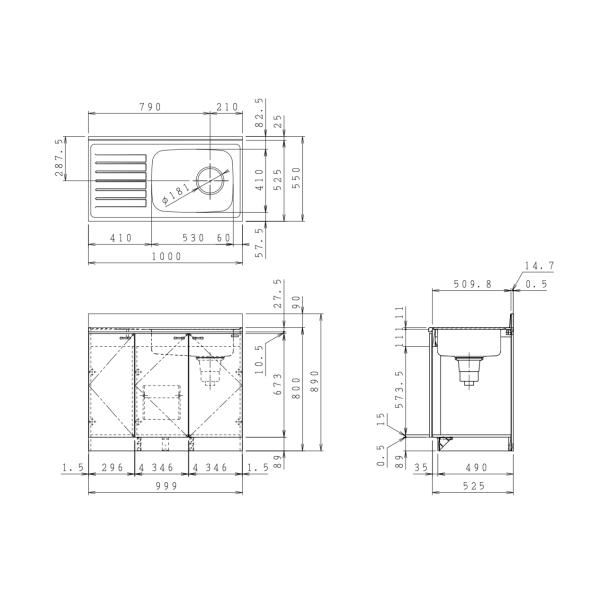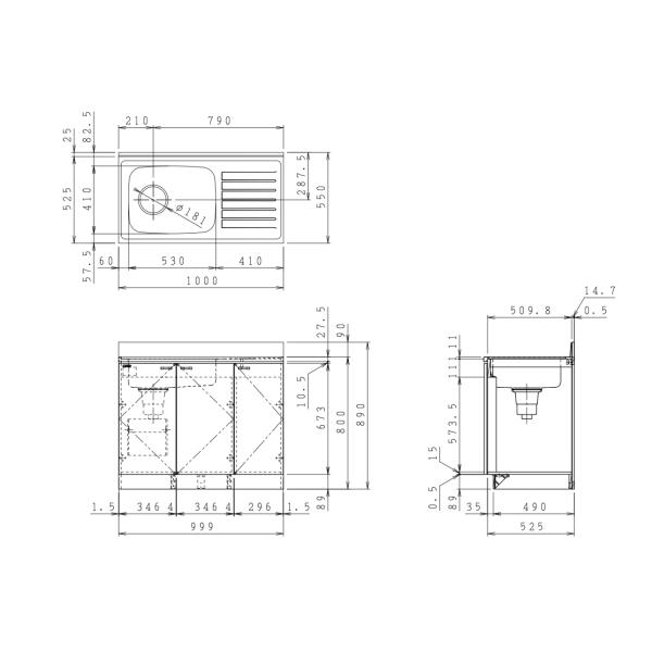 幅1000mm×奥行き550mm×高さ800mm(バックガードまでH890mm)