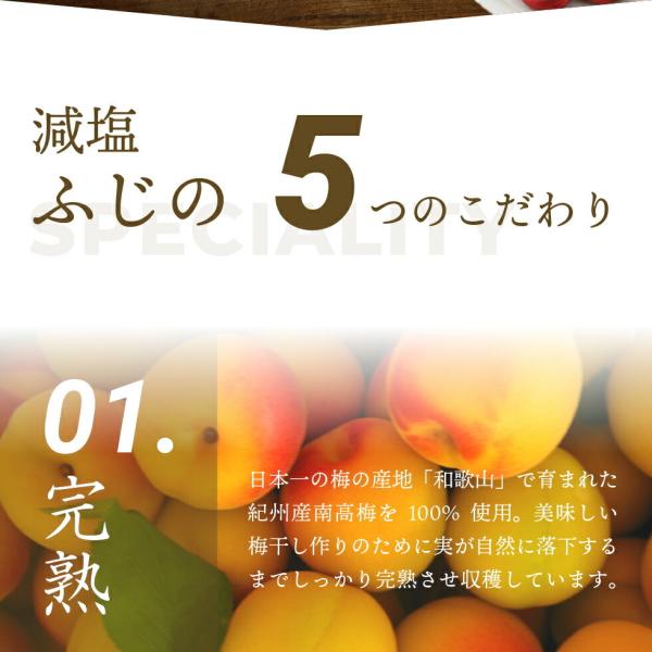 毎日食べたい、塩分が気になる、酸っぱいのは苦手…というお悩みの方へ、塩分を約80%カットした減塩梅干し 塩分1.5%をご用意しました。