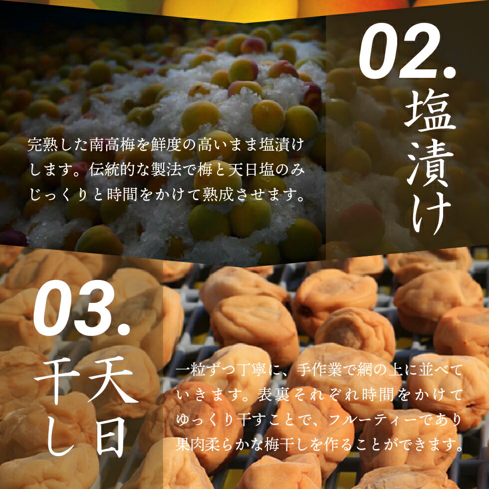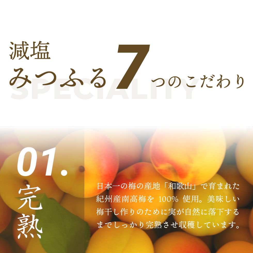 「特選」南高梅を使用。塩分約1.5%の減塩梅干しを一粒一粒丁寧に包み込みました。