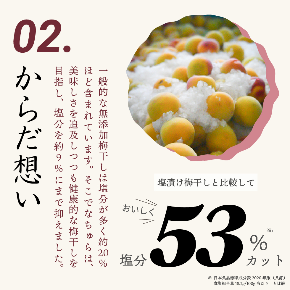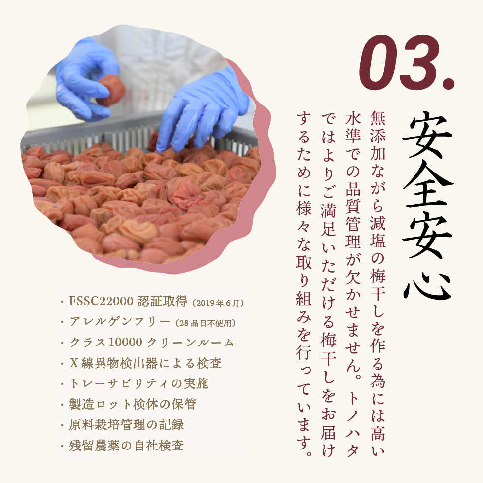 昔ながらの梅干しの美味しさを再現しつつ、食品添加物すべて無添加ながら塩分を9%に抑えたこだわりの梅干し。