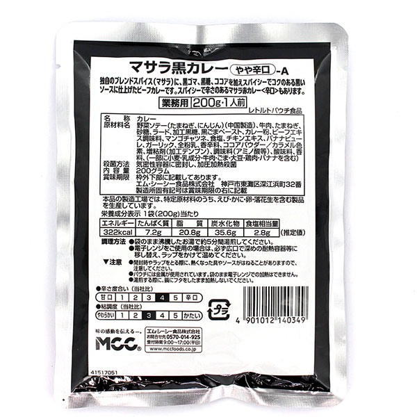 独自のブレンドスパイス(マサラ)に、黒ゴマ、黒糖、ココアを加え、スパイシーでコクのある黒いソースに仕上げたビーフカレーです。やや辛口の味わいです。・内容量:5袋【1人前200g(レトルトパウチ食品)】
