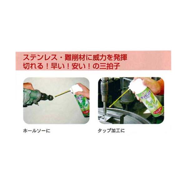 環境対応型(塩素フリー)、ネジ穴加工用スプレー、ステンレス、難削材に威力を発揮、切れる、早い、安いの三拍子、タップ・リーマー・ドリル