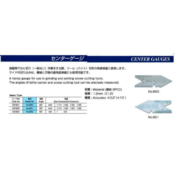 No650 センターゲージ(60°インチ目盛り) 旋盤などでねじ切り(一般ネジ)作業をする際ツール(バイト)刃形の角度検査に使用 フジツール