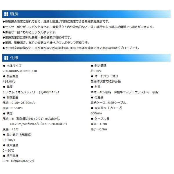 ・微風速の測定に優れており、風速と風温が同時に測定できる熱線式風速計です。