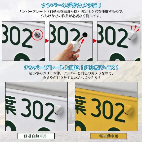 バックカメラ ナンバープレート取付 超小型 CCDセンサー採用 100万画素 水平180度 垂直140度 超広角 IP69K防水防塵 超強暗視機能 12V対応 ホワイト イェロー