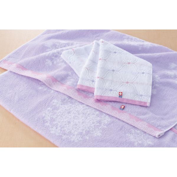 後加工をすることにより吸水性がよく、レースがらのタオルは甘撚り糸を使用し、さらにやわらかな風合いになっています。