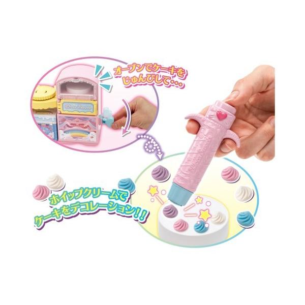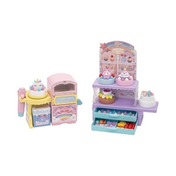 ケーキを準備するオーブン、デコレーションが楽しめるクリームしぼりきとパーツ、完成したケーキを飾るショーケースなど、パティシエごっこが一連で楽しめるセットです。