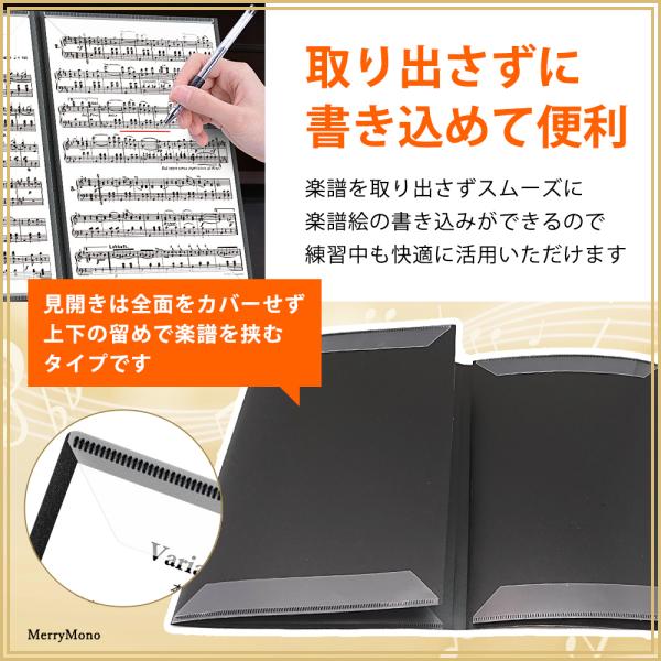 見開きは全面をカバーせずに上下の留めで楽譜挟むタイプ。楽譜を取り出さずにスムーズに楽譜絵の書き込みができるので、練習中も快適に活用いただけます。