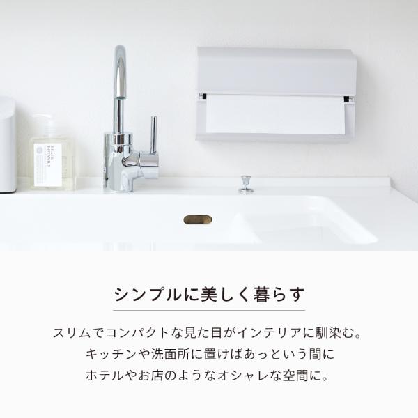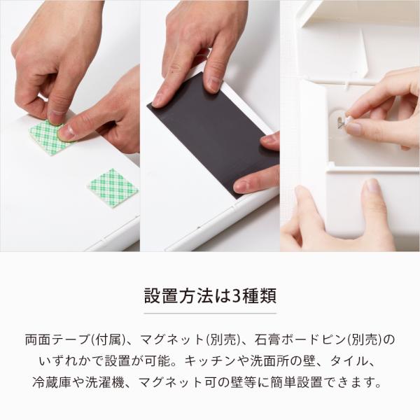 この場所にペーパータオルホルダーを設置したいが叶うペーパータオルケース。厚みは6.5cmスリムでコンパクト。かさばらない壁掛けタイプだから洗面台や卓上がスッキリ。卓上型は手に付いた水分が垂れて濡れてしまいがちですが、壁掛けタイプなら濡れてしまうことがありません!まるでお店やホテルのような素敵な水回りを作ってみませんか?設置方法は両面テープ(付属)、マグネット(別売)、石膏ボードピン(別売)の3種類。